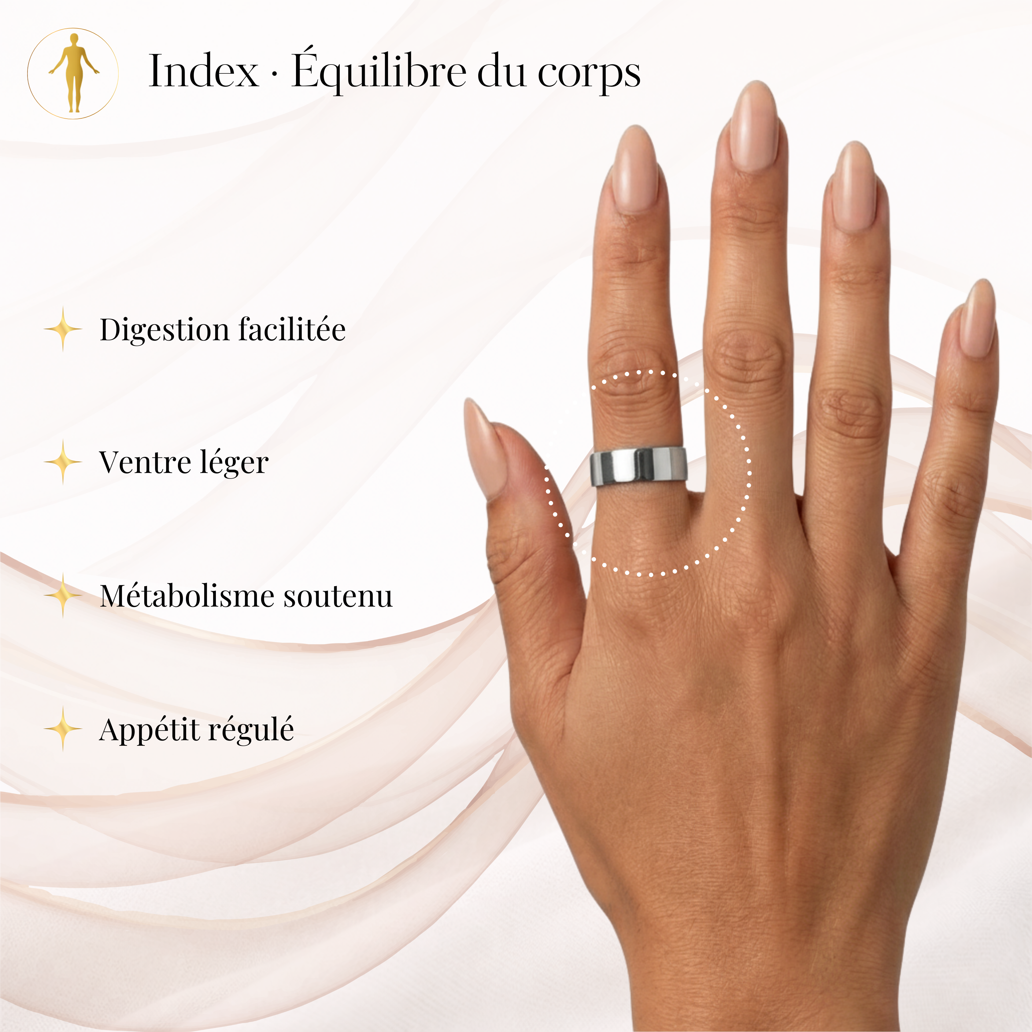 Une bague élégante qui associe acupression et magnétothérapie pour aider votre corps à retrouver son équilibre.