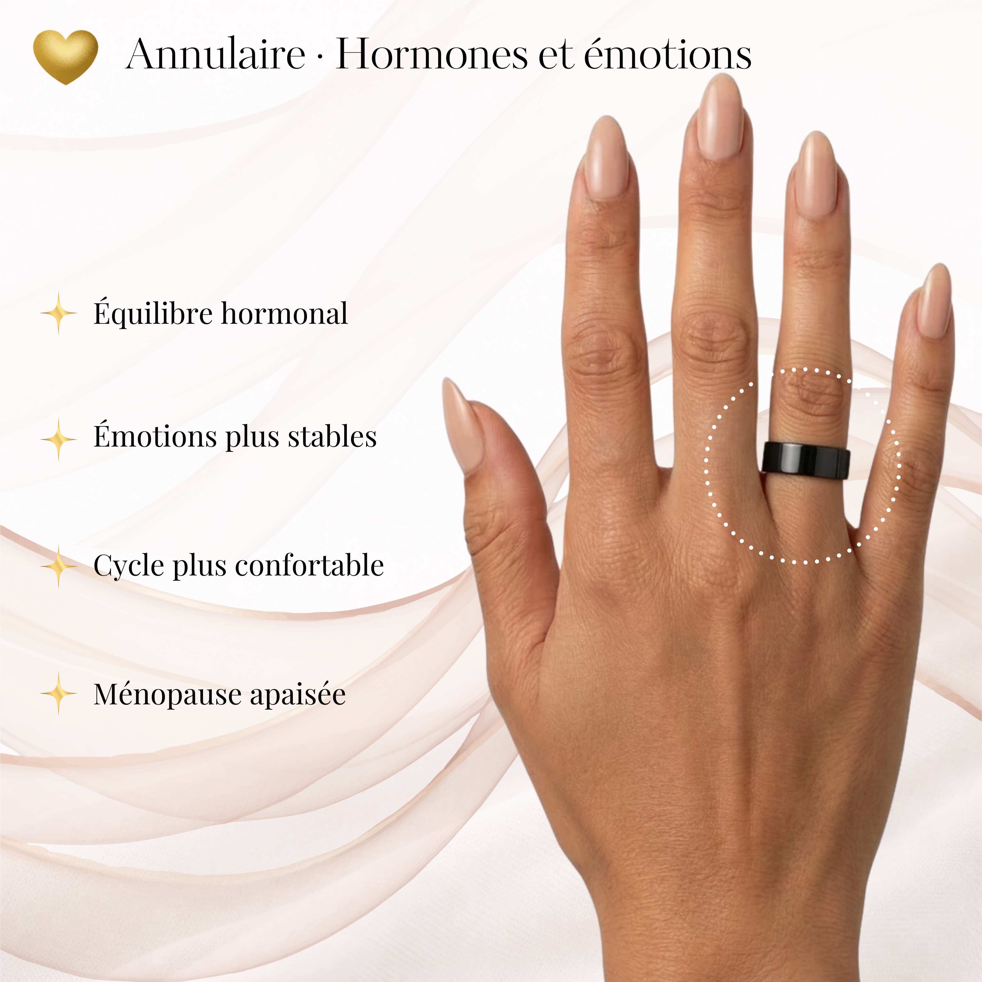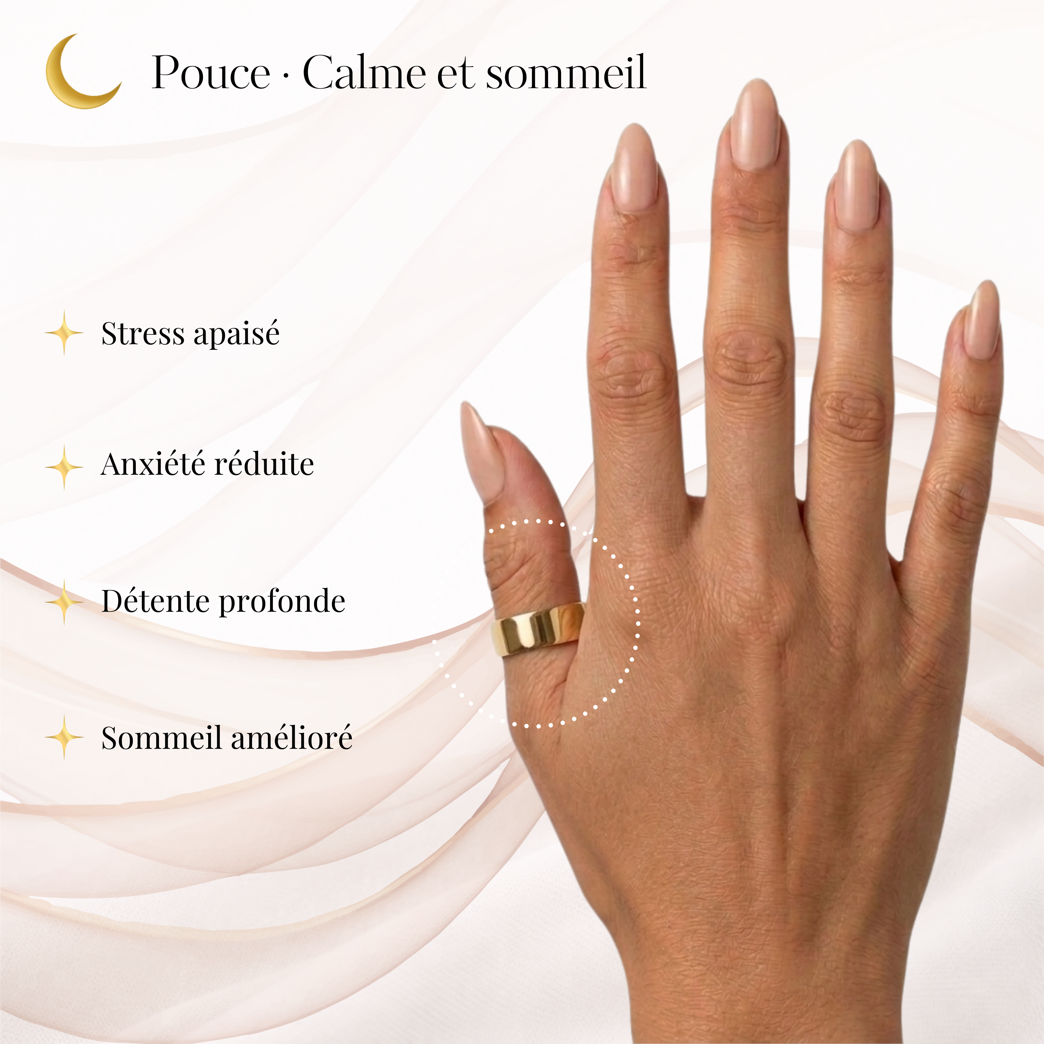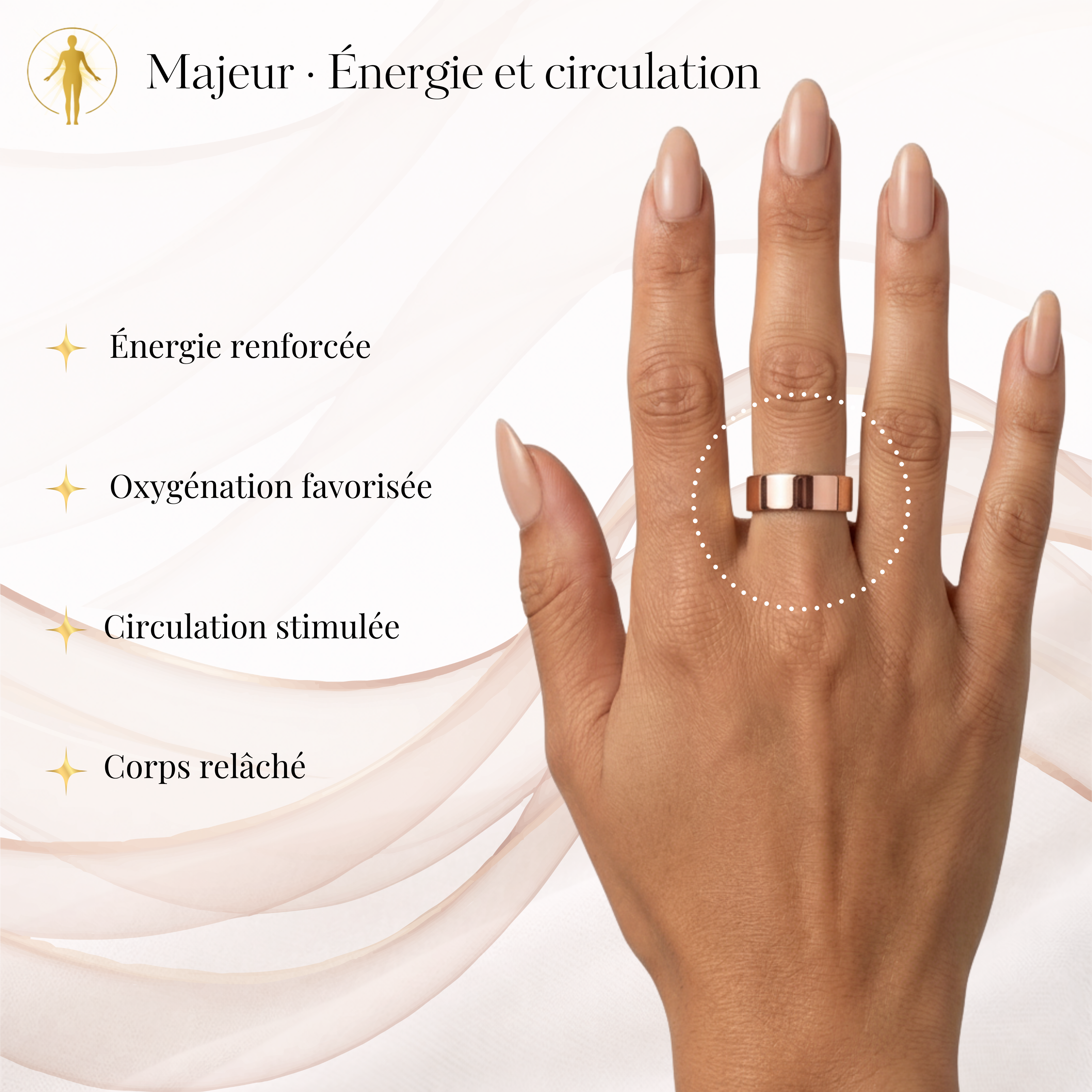 Grâce à ses quatre aimants intégrés, la bague stimule doucement votre corps et aide à réduire le stress, favoriser un meilleur sommeil et retrouver une énergie plus stable au quotidien.